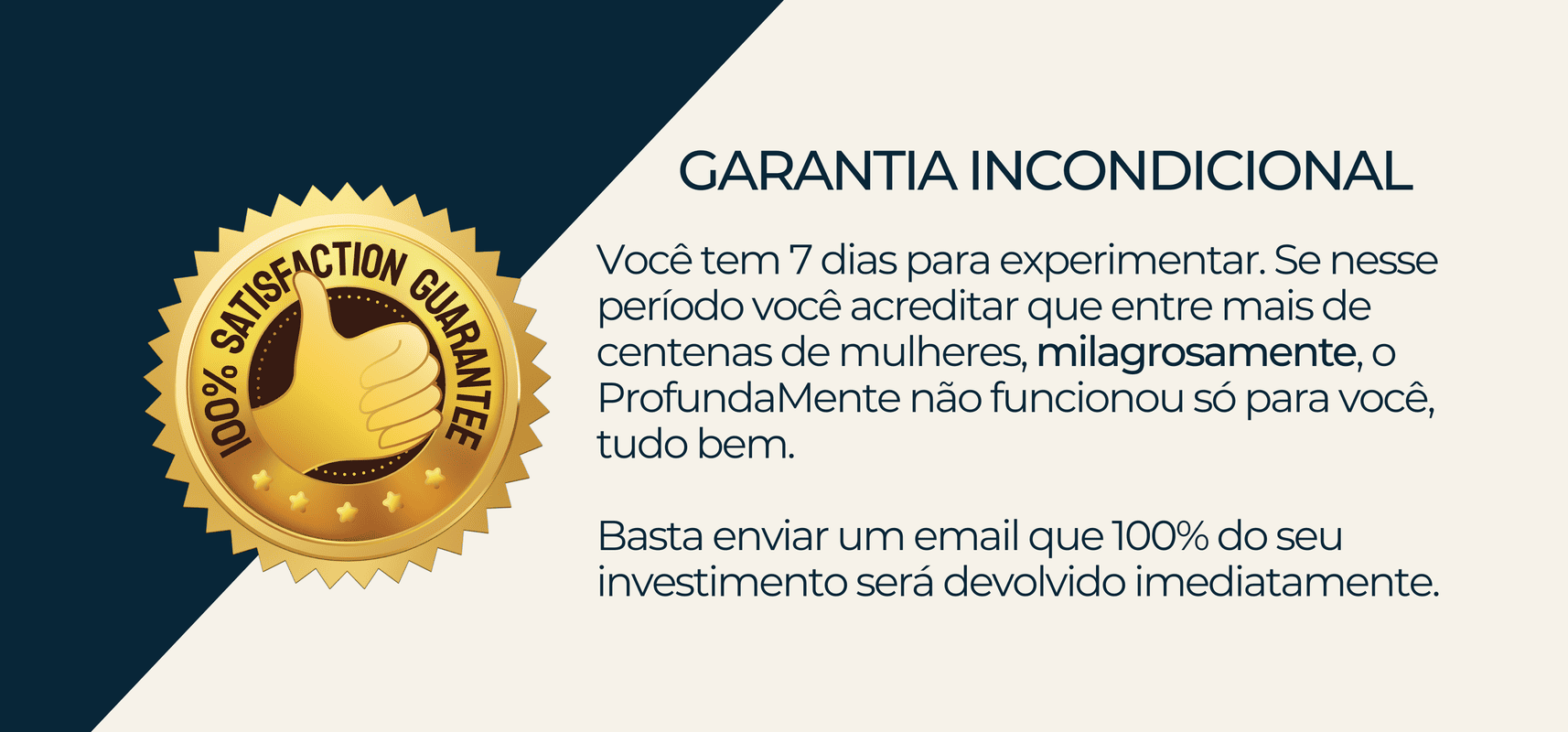 Você tem 7 dias para experimentar o ProfundaMente sem riscos. Se por alguma razão achar que o investimento não valeu a pena é só solicitar o reembolso através da plataforma. É importante dizer que não fazemos fazemos reembolso depois desse prazo.